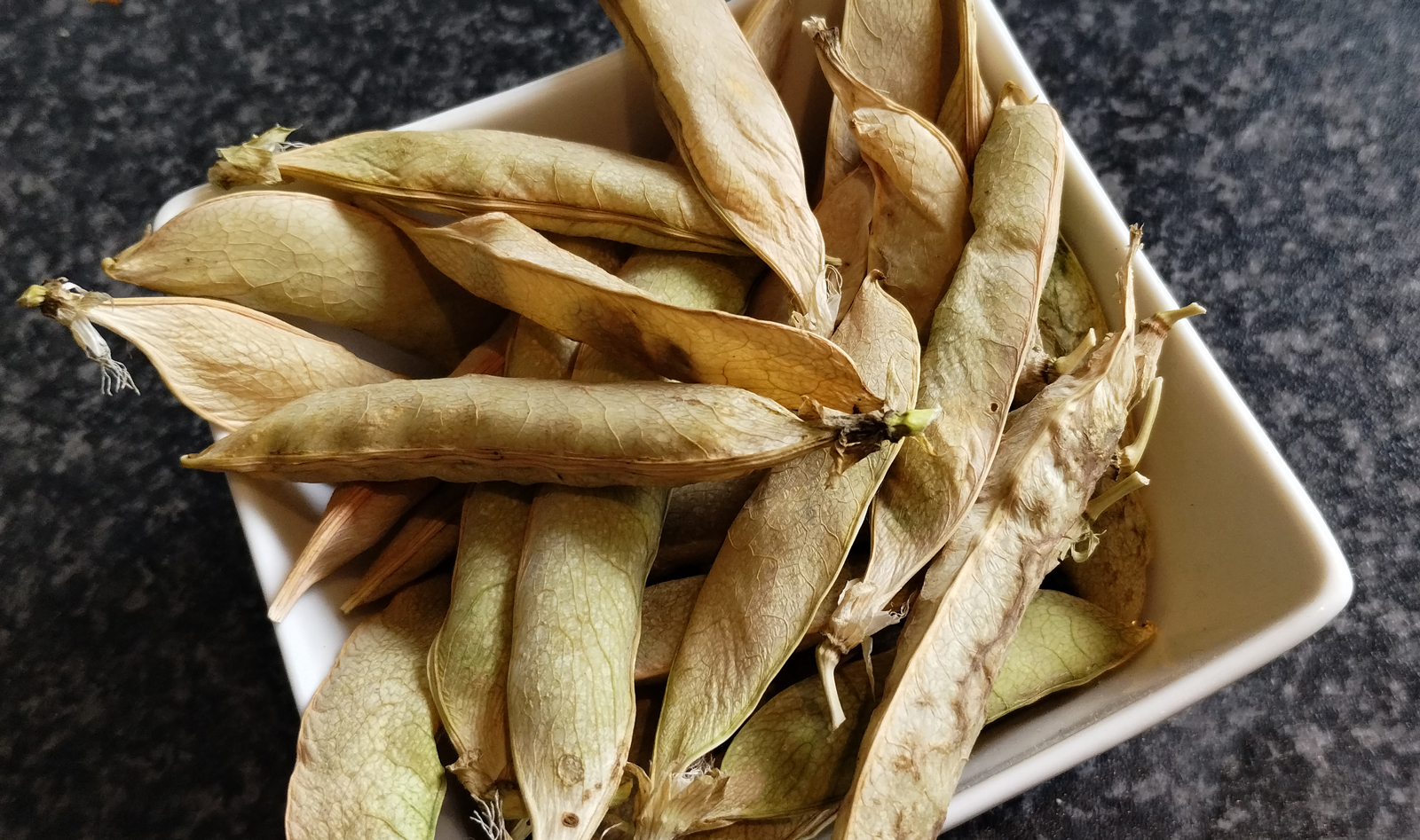 Harvested pea pods left to dry – the seeds inside them can be sowed next spring