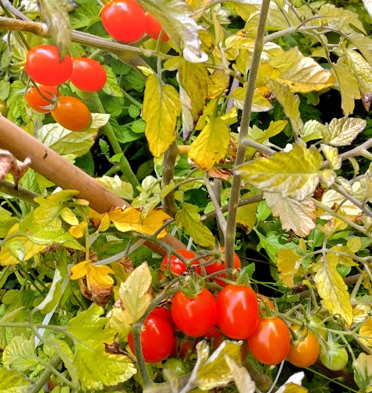 Meanwhile the tomatoes are finally turning red and I’m getting a good handful every day for lunch, etc. With just three varieties on the go this year – Crimson Plum, Aviditas and Tomatoberry – it’s easy to monitor the consistency and the ripening is nicely staggered across the varieties.