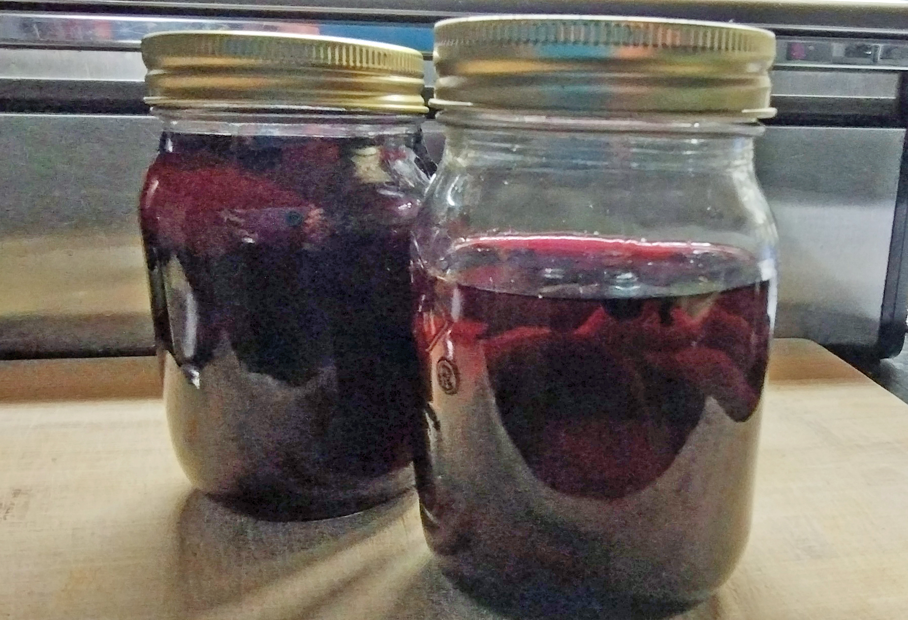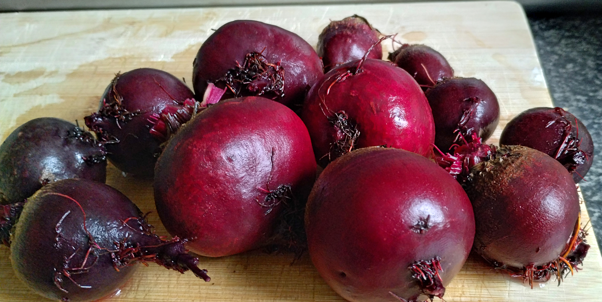 Next to them, I lifted the last of the Boltardy beetroot. These were all in good shape, but in various sizes. Cleaning both those and the carrots up, I halved the carrots into the best shape for roasting later and froze them. Then baked and pickled the beetroot. As usual, peeling and slicing the beetroot had the kitchen looking like a murder scene.
